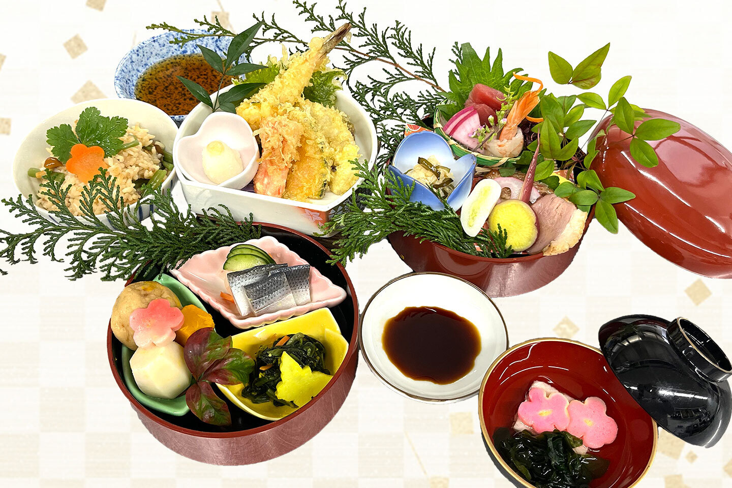 お品書き:上刺身盛合せ、八寸、煮物盛合せ、デザート盛合せ、酢の物、天ぷら盛合せ、バラちらし寿司&炊き込みご飯
