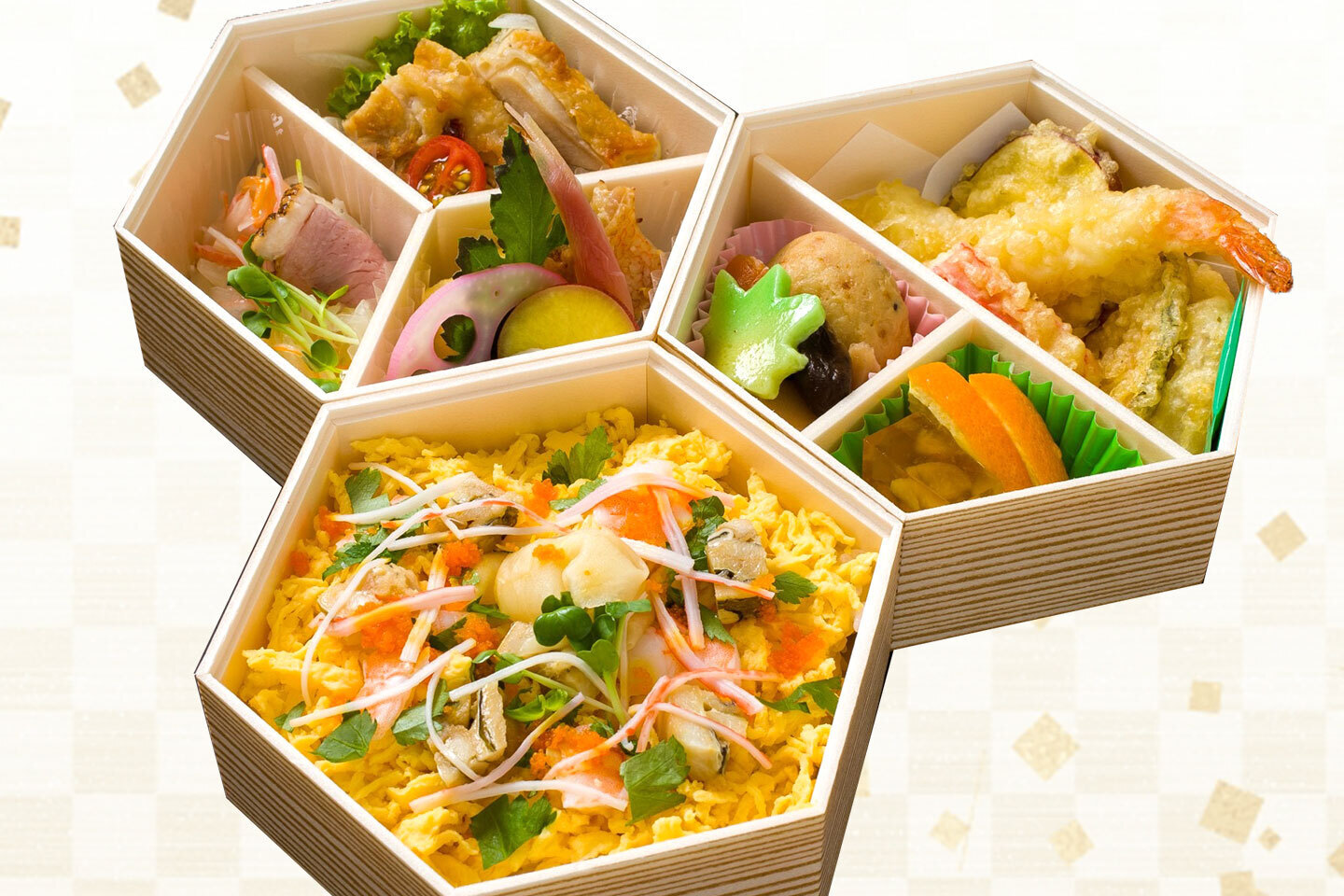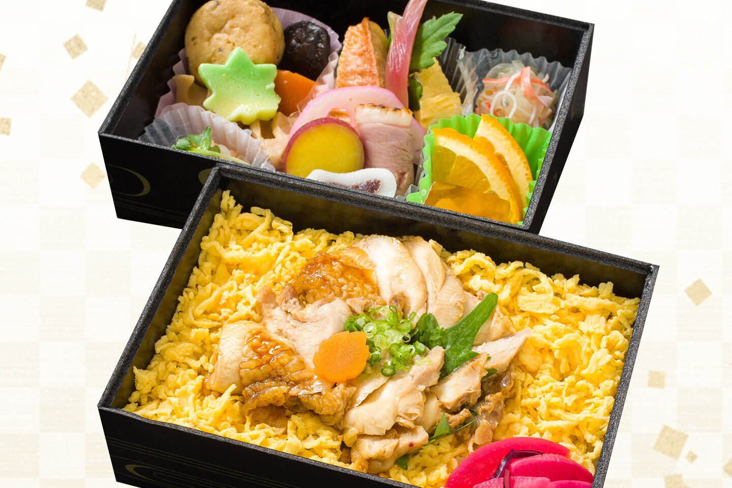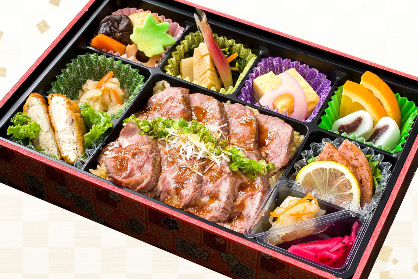 お品書き:八寸、チキンステーキ、煮物盛合せ、デザート盛合せ、小鉢、海老天ぷら盛合せ、ローストビーフ重&季節の炊き込みご飯